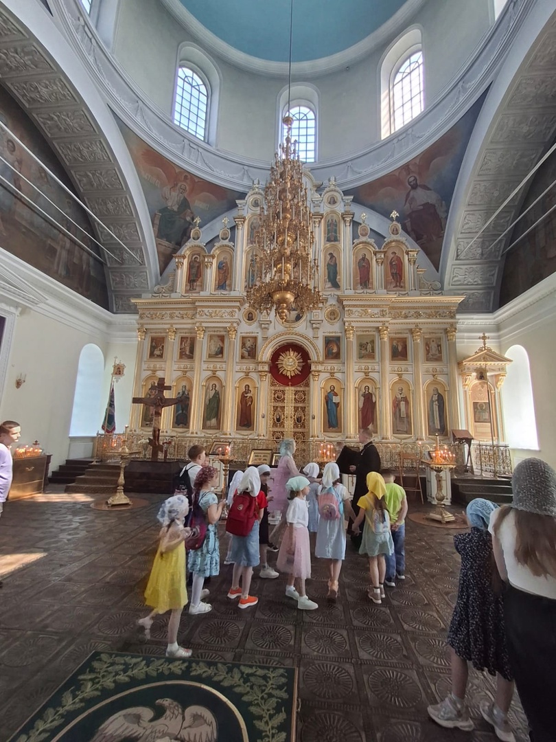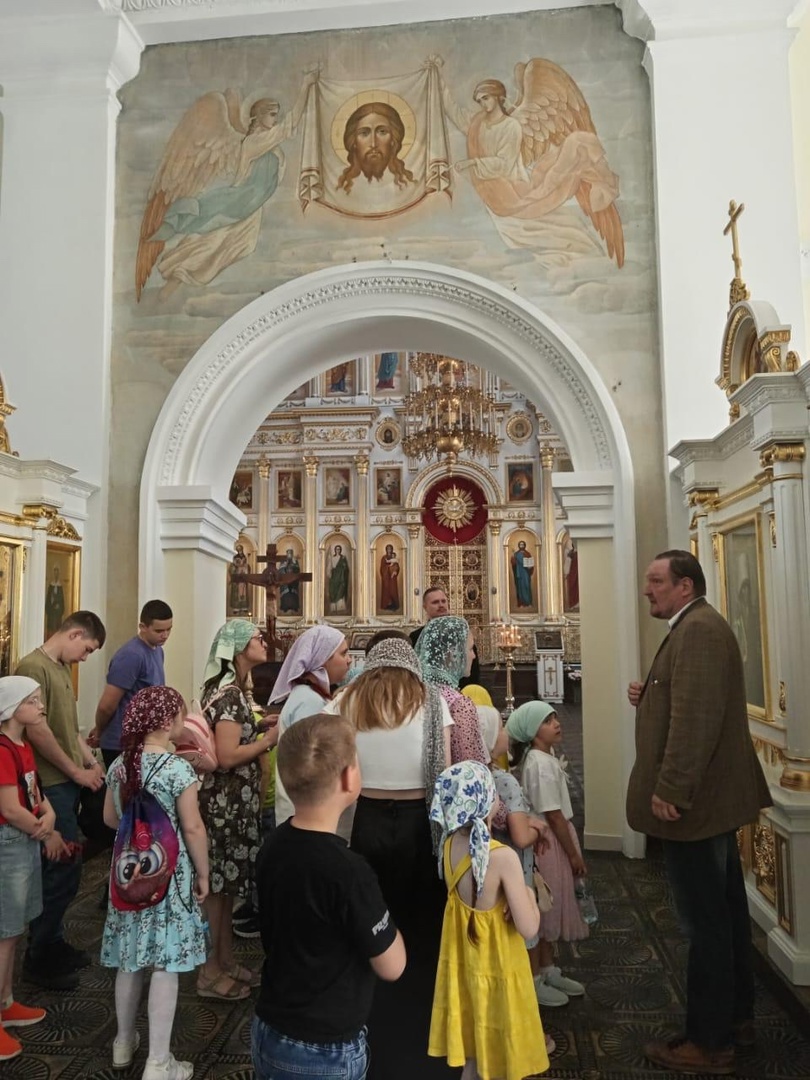 Далее экскурсия продолжилась в самом храме. Отец Петр провел детей по внутреннему убранству храма, познакомив их с устройством церковного пространства и особо чтимыми иконами, которые хранятся здесь, напоминая о многовековых традициях и вере нашего народа.