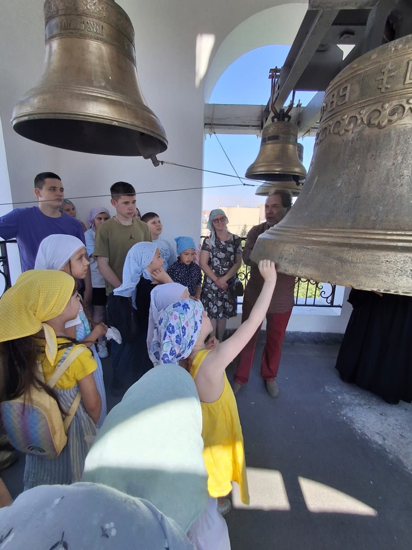 После экскурсии внутри храма детям предоставилась уникальная возможность подняться на колокольню. Владимир Дмитриевич рассказал о колокольном звоне, его значении и технике исполнения. Под его чутким руководством ребятам удалось самостоятельно начать перезвон колоколов.
